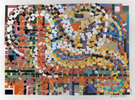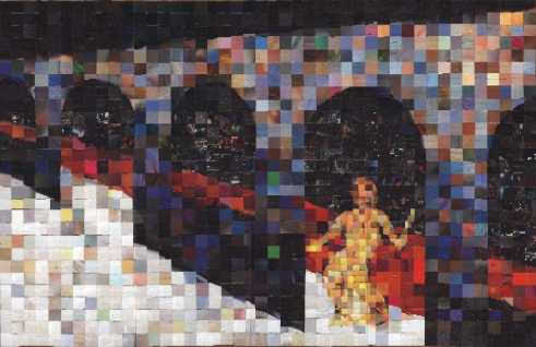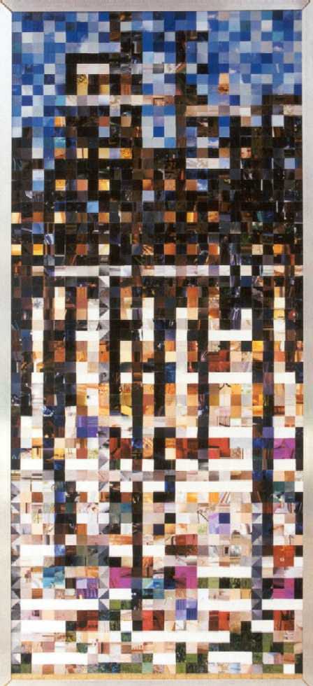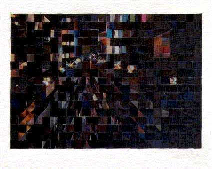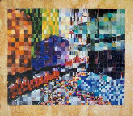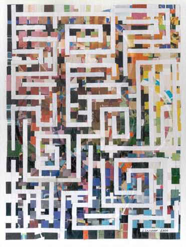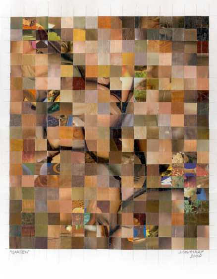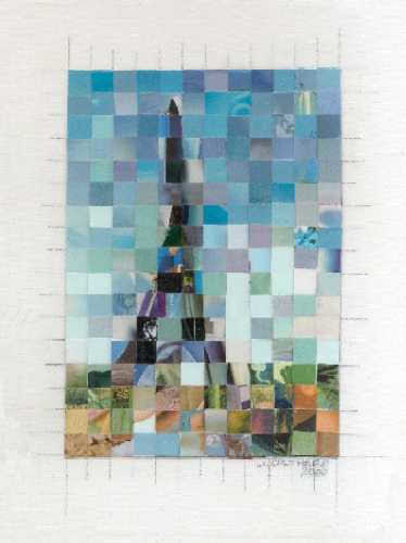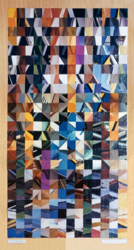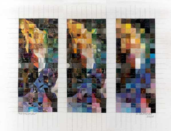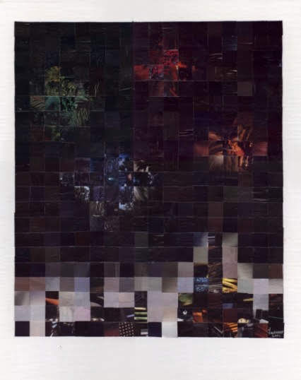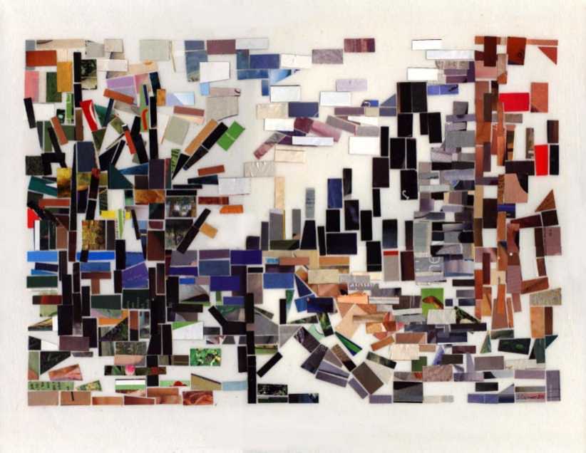 Most of my work during phase one centered around cityscapes, the female form, explorations of color, and experimenting with the nature of the medium itself to see what I could get the little bits of paper to do. I worked primarily on plywood and masonite boards, canvas boards, watercolor paper, and occasionally experimented with adding other media to the mix (i.e. clear resin, found objects)